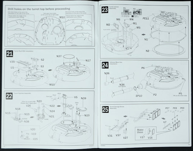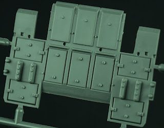 Step 25: The gas mask/ personal storage cabinets which hang on the side of the turret are fun to build and look even nicer with the PE handles which can be applied stretched open or tight to the boxes. Step 26 has you assembling the other stowage for the turret - ammo and other boxes which are a simple affair.