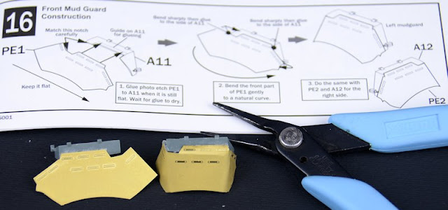 Step 16: This step tells you to bend the PE mudguard AFTER they are on the plastic parts they are attached to – don’t do it! Bend at least the first part down before you secure it with superglue or you risk damaging the plastic guard part – the guards aren’t as tough as they think! Check your references for this as you want to capture the natural look of the rubber guards. I had a nice pair of Xuron bending pliers to help me on this – a great tool if you can get one in your arsenal.