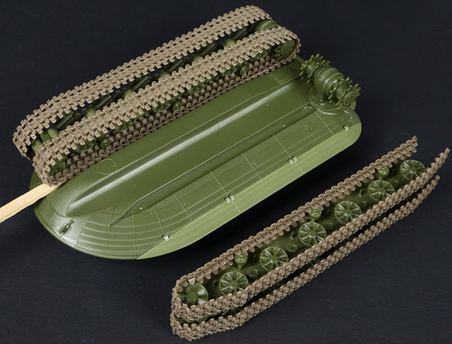 2: Attaching them with the sponsons off the hull (above) – This I found worked a whole lot better and is my (and should be your) choice of doing this. You make the links in their allocated bunches – glue them to the road wheels on the sponsons off the vehicle and when you want to get them on the kit just secure up the rear links. A much better way to do it.