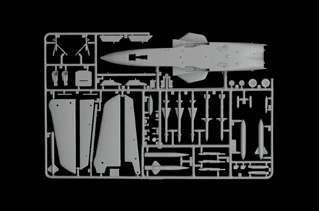 extremely thin, small, straight mid-mounted, trapezoidal wings, the stabilizer mounted atop the fin, a powerful and reliable General Electric J-79 turbojet
