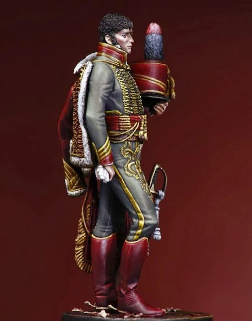 Well look at this dandy! This mounted figure depicting a Colonel of the 7e régiment de hussards sure cuts a nice shape as he is seen tipping his cap to someone in a an act of saluting or respect.