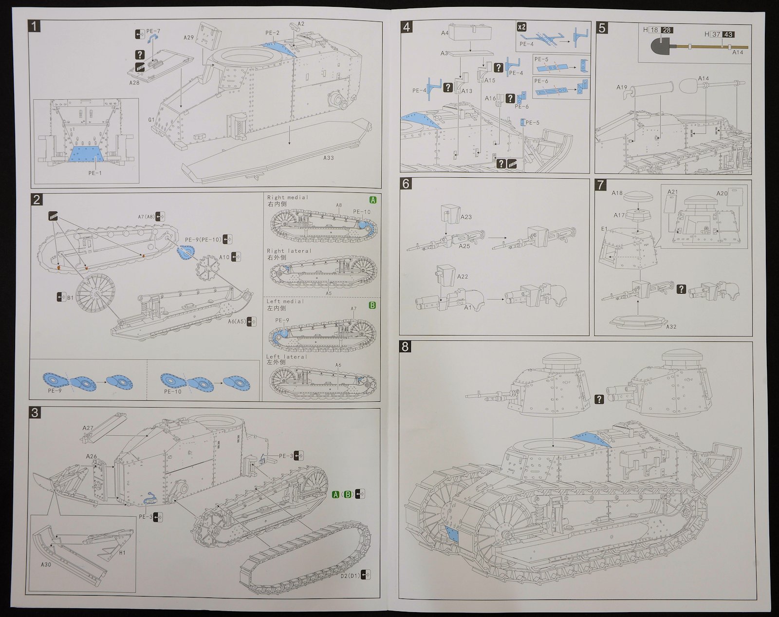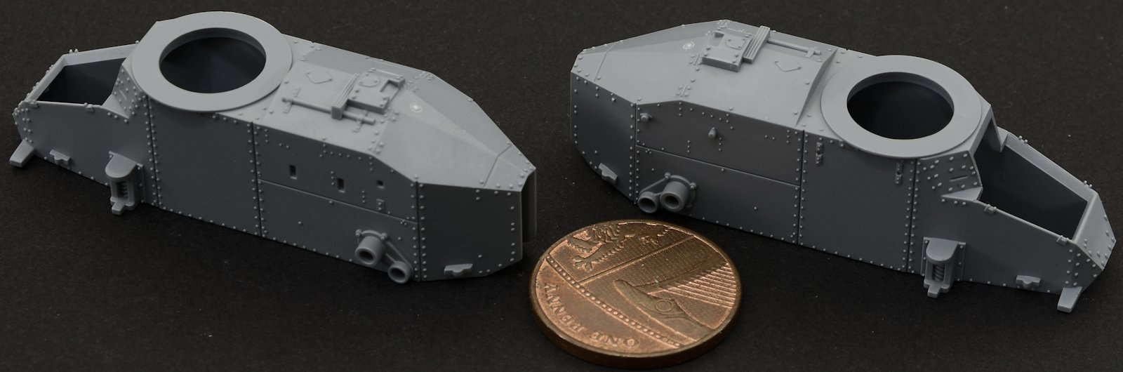 there are four riveted turrets in this box so in essance you can make the same kit twice or like i did one of each of the guns - the "female” machine-gunned variant, which took up 2/5ths of the production while most of the rest were the "male" tanks, armed with a short-barrelled 37mm (1.45 in) Puteaux SA-18 gun. The turret can be opened at the rear if you like but there isn't any interior included.