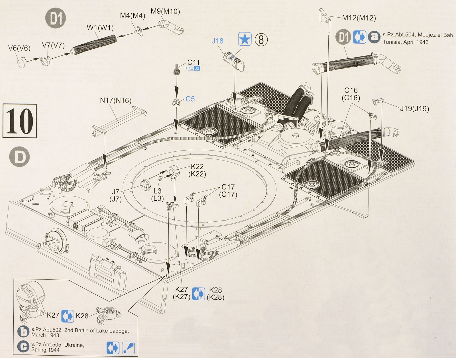 Lots of tiny parts are added to the hull also, brackets and more tools, including the right type of shovel for Tiger 131. Other variants are helpfully pointed out in the instructions when you need to make the right choices.