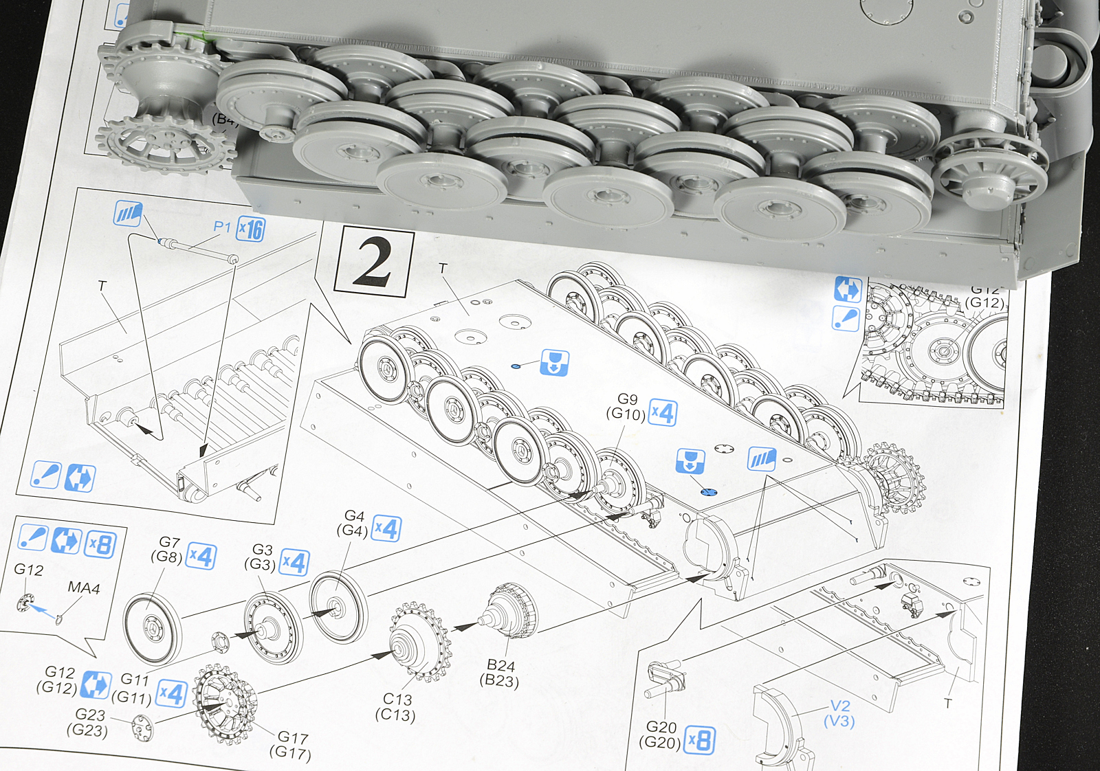 Here are the road wheels in-situ. These can be taken off and painted if you take them all off and replace them as you see them. Intertwined. It will help with the painting of these. It’s also what everyone does who builds up the model unpainted to show you the detail in the same way.Step 3