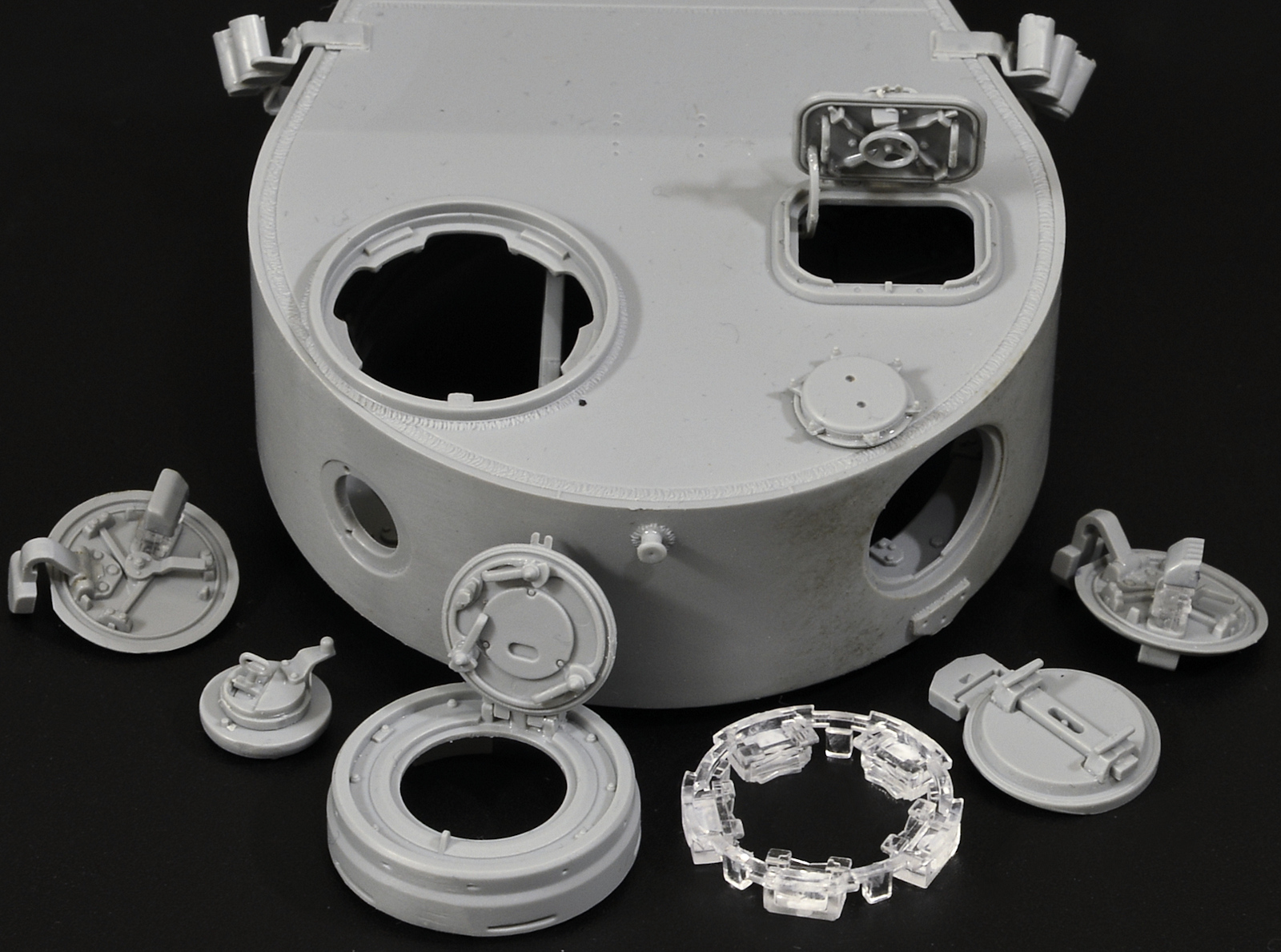 The two hull hatches for the driver and radio operator/ gunner are a sub assembly in this step, you get clear periscopes and a full interior hatch with large hinges and handles all there. This is great if you want to display the hatches open (with a person inside as there is no real interior) or alternatively leave all of this off if you want to close them up.