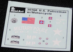 The box top artwork is the only marking option provided and is used to illustrate the decal placement on the MP figure. The bike is provided in colour in a four view profile, although it is predominantly olive drab.