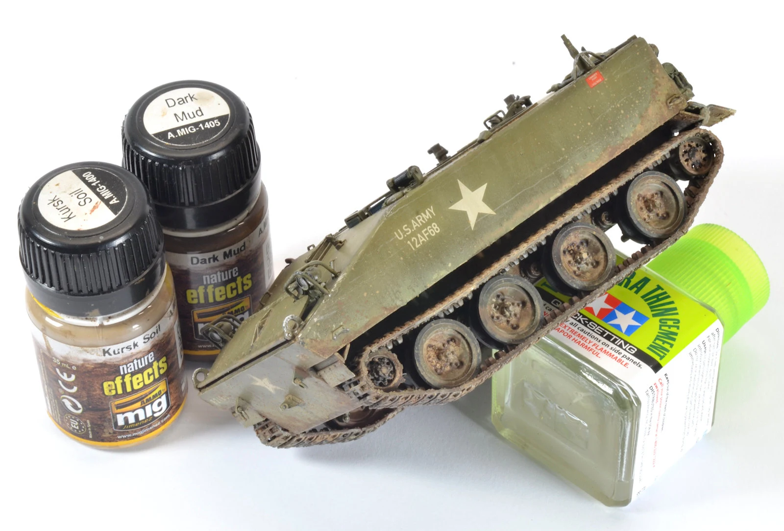 The AK paste and the dusted layer helped to create textures and the effect of dust, but now the effect is enhanced using enamel washes. Dark Mud and Browns are concentrated on the deeper recesses and around wheel hugs and the Kursk soil helps soften the effect through the centres of the sections.