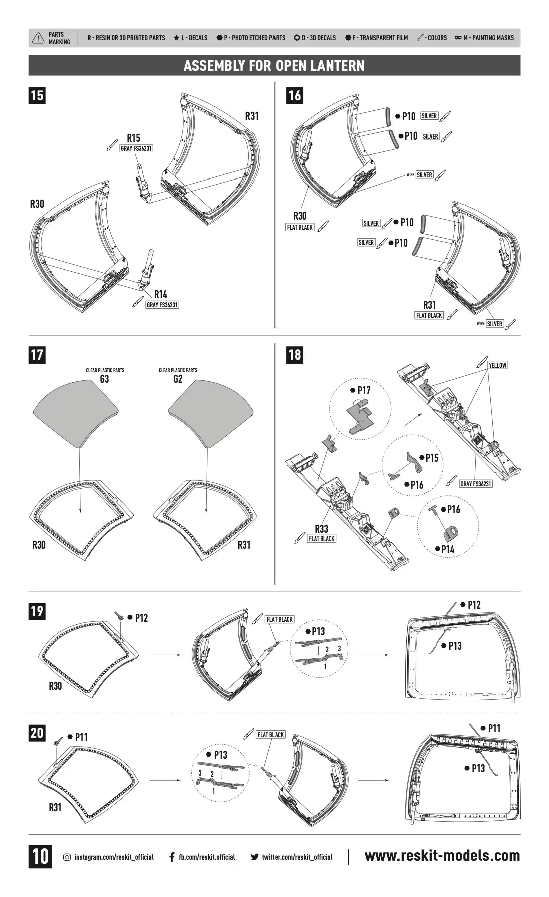 Not all parts are suitable for casting in resin or even 3D printing. Typically parts meant to represent sheet metal are best provided in photo-etch brass. Reskit also include a set of pre-cut paint masks for the windshield (G1) only (both inside and out). Why they didn't make masks for the canopy door clear parts (G2/G3) is a bit of a mystery to me.