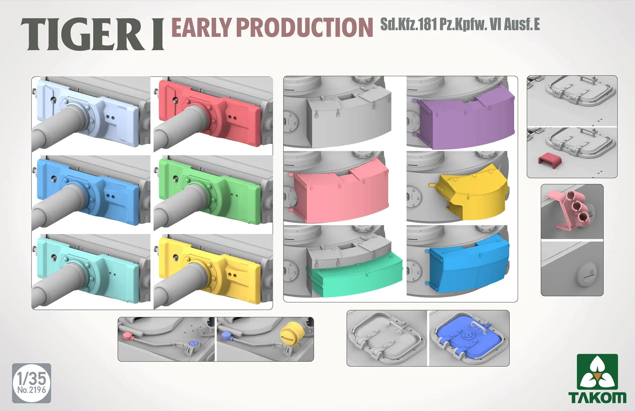 In this second tank's CAD design images, we see a new close-up in-detail images showing the alternate options that Takom's designer has moulded to this kit. We can see the six different types of turret bin stowage, turret mantlets, options for smoke discharger, vision ports, NOTEK (or not) light and front hatch.